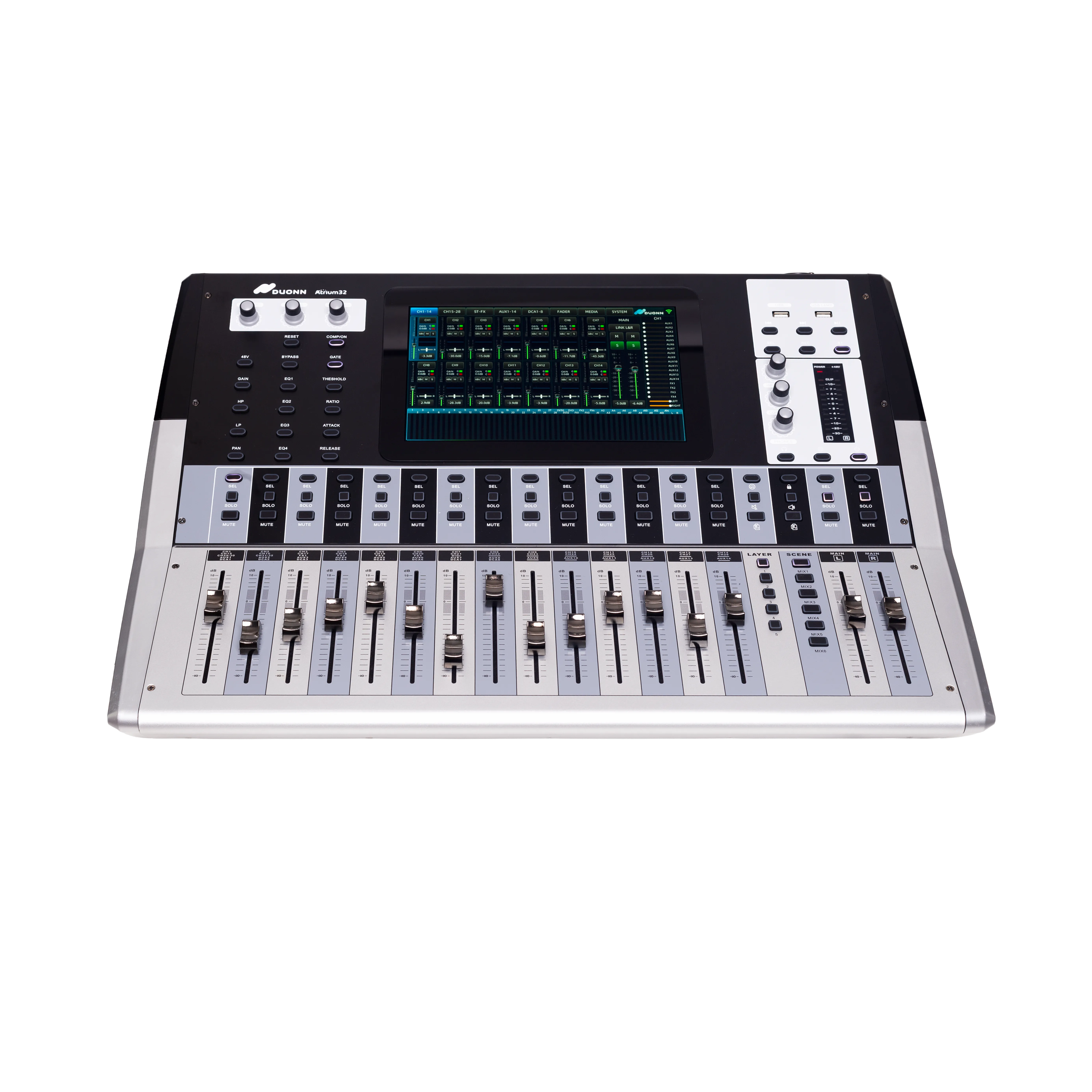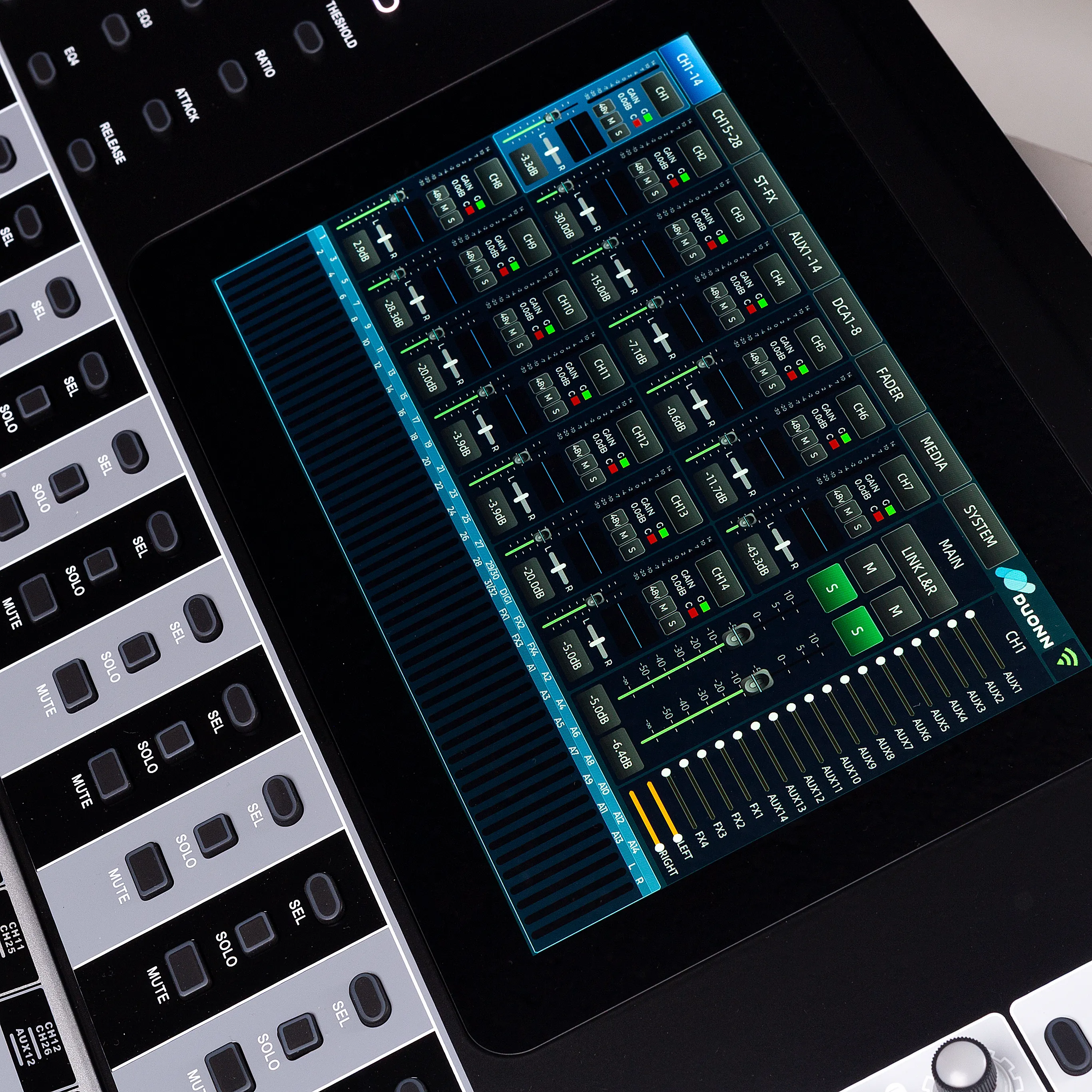 • 14 Auxiliares Pré e Pos com saidas XLR